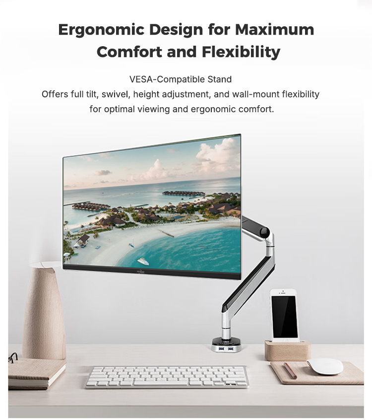 Ultimate Ergonomic Freedom. The standard VESA 100×100 interface allows you to unleash your desk space with a wide range of monitor arms and mounts for the perfect gaming or productivity setup.