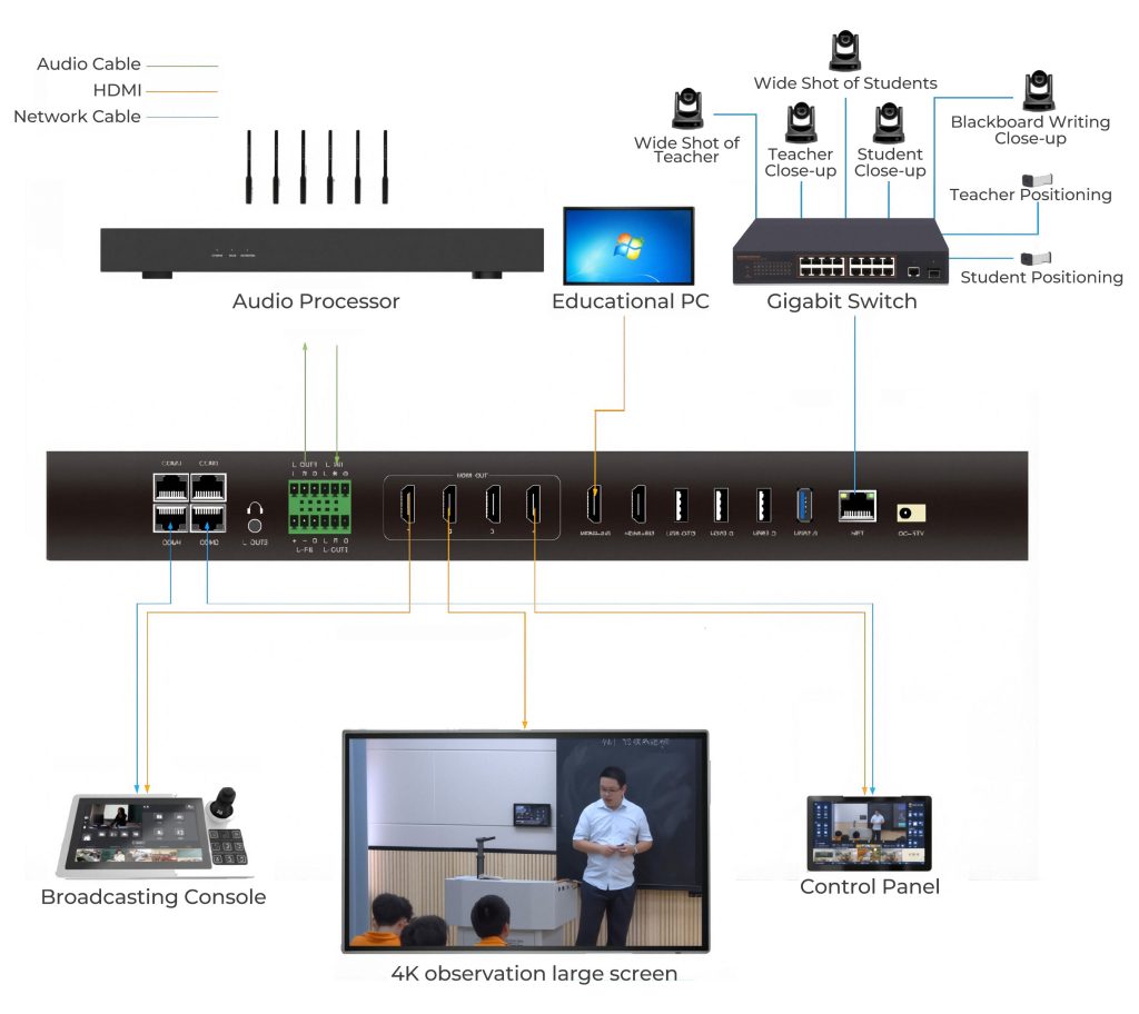 The TENFLY 4K Premium Recording Classroom Solution is an advanced five-camera automated lecture capture and live teaching system. Engineered for interactive classrooms, distance learning, and top-tier education broadcasting, it offers intelligent tracking, ultra-high-definition 4K recording, seamless audio-visual integration, and real-time interaction. Supporting interactive classrooms, distance learning, and education broadcasting, it offers customizable configurations to meet each institution’s unique needs, enabling schools to build smart, flexible teaching environments with ease.