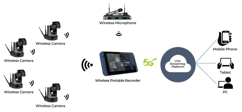 Includes wireless PTZ camera(s), wireless microphones, and a compact portable recording host—all integrated in one system with battery and network support.