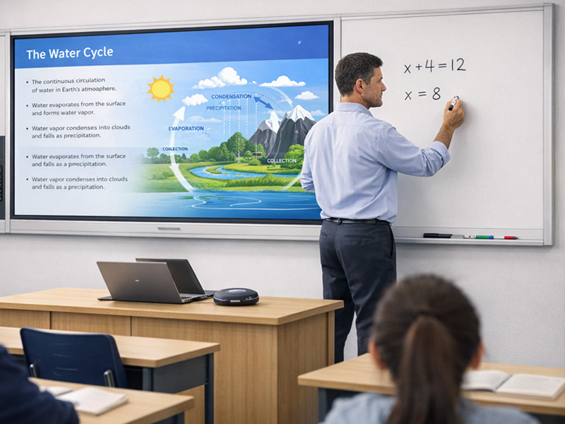 Standardized display and computing hardware supports large-scale classroom deployment and centralized management across public education systems.